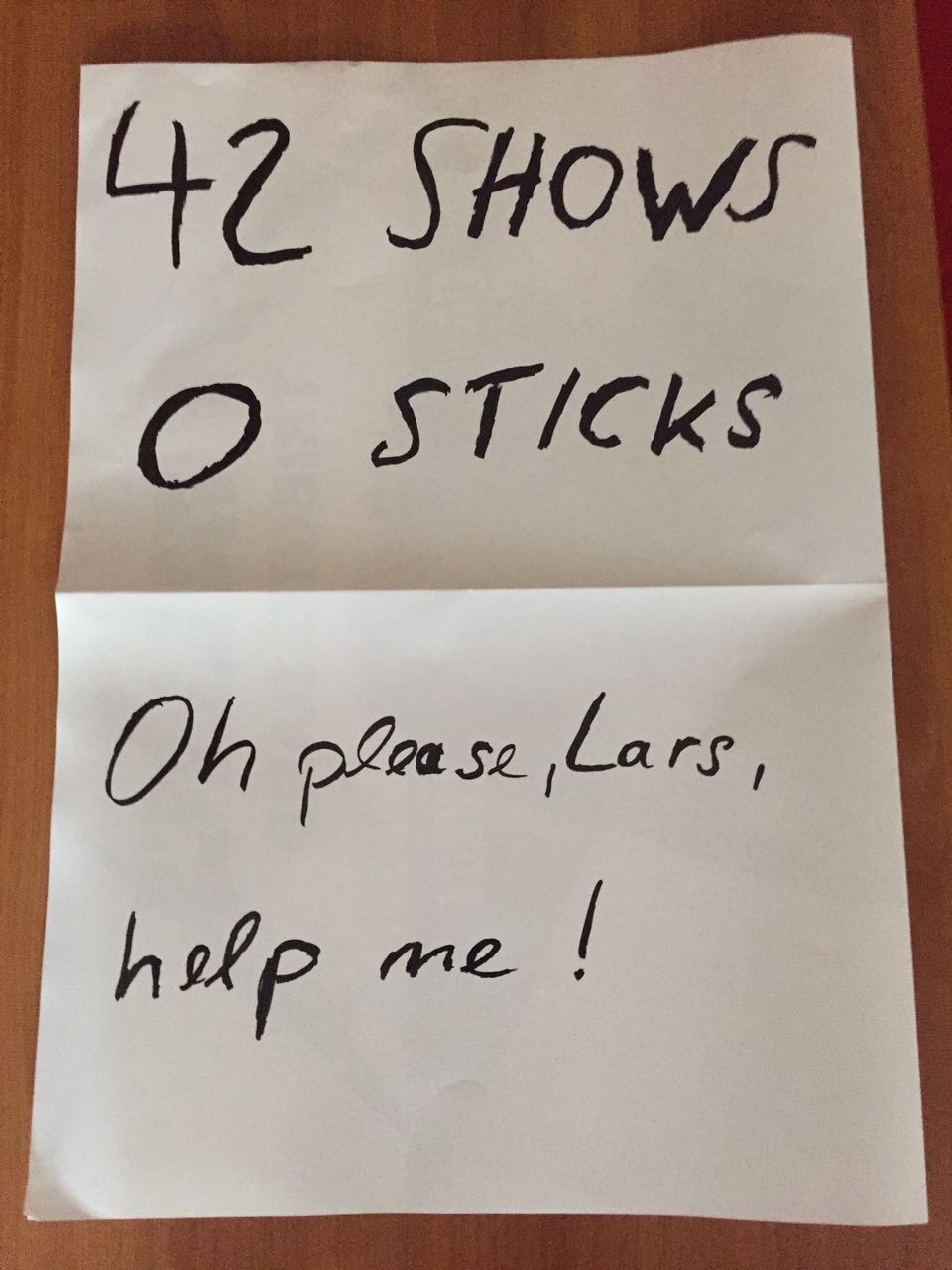 Bei der Metallica-Show in Köln 2017 bekommt Stephan einen Stick von Lars geschenkt, der nicht nur für Schlagzeuger als heiß begehrtes Metallica-Souvenir gilt. Beim nächsten Treffen der beiden – im Februar 2018 in Mannheim – revanchiert sich Stephan mit einem MY’TALLICA-Drumstick bei Lars. Auch hier wechseln die Lars Ulrich Signature-Drumsticks aus dem Hause Ahead die Seiten.